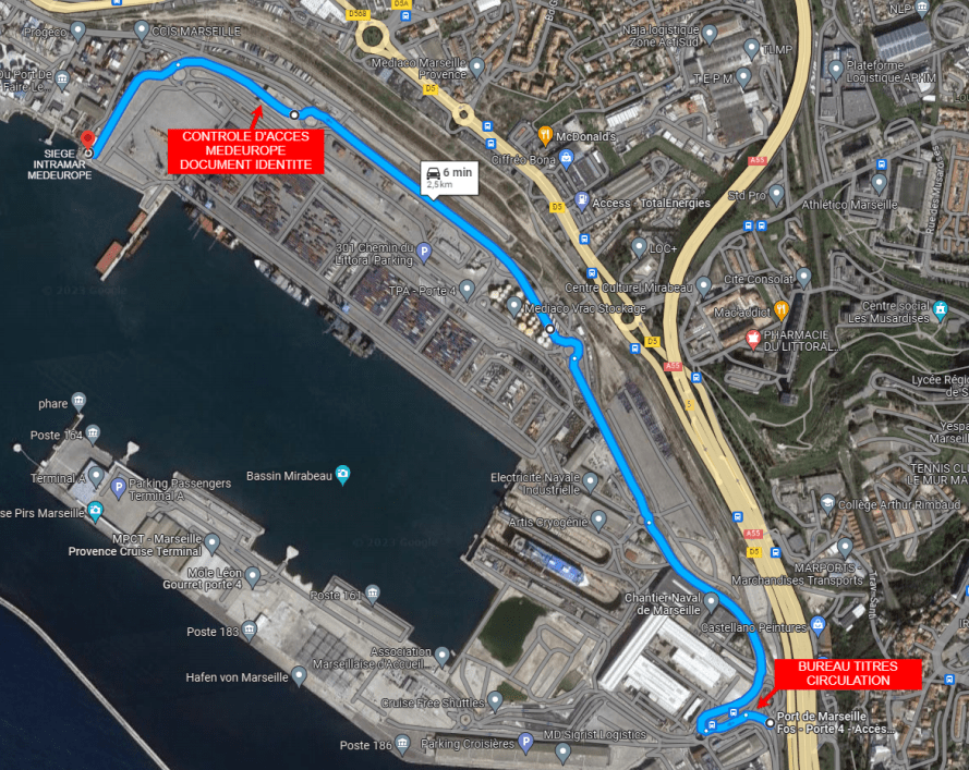 Depuis la porte 4, suivre le plan jusqu’au bureau de contrôle d’accès Med Europe Terminal.
